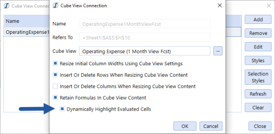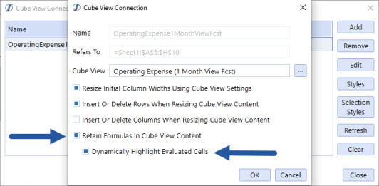 Dynamically Highlight Evaluated Cells saves you a step because the cell changes without requiring a refresh. This feature identifies the values in the cube view that have changed relative to its original value in the database. Evaluating all the cells in the spreadsheet.