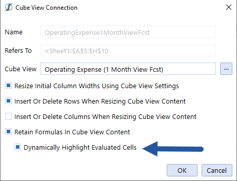 Click Retain Formulas in Cube View Content to activate Dynamically Highlight Evaluated Cells.