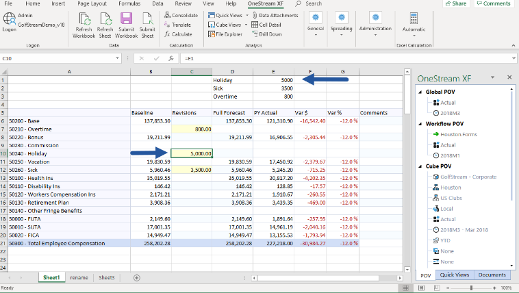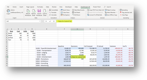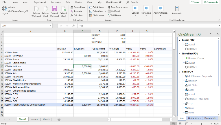 The Retain Formulas in Cube View Content feature, allows users to plan, budget or forecast and use the familiar functionality of Excel while still submitting data back to the OneStream database.