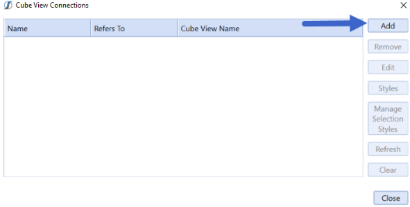 From this window, the cube views added to an Excel workbook can be managed. You can add, remove, edit, or go to styles. Click Add, to add a new Cube View.