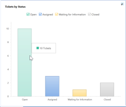 Charts in the Ticket Analysis page include a legend that lets you further specify the tickets you want to display or exclude in the charts. The legend has check boxes corresponding to the statuses that can be assigned to tickets. To filter the tickets shown in a chart by status, check the boxes for the statuses to include and clear the check boxes of the statuses not to include. These check boxes can be cleared and selected at any time to customize the tickets represented in the charts.