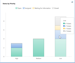 Like the Tickets by Status chart, you can hover over any of the bars in the chart. For the Status by Priority chart, hovering over a bar shows the number of support tickets for each status within the priority.