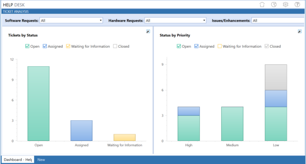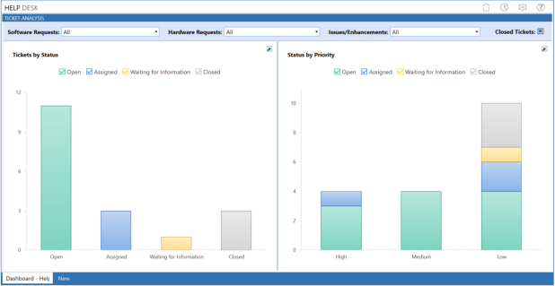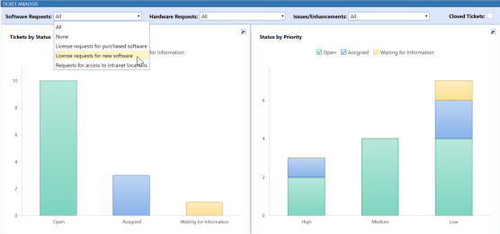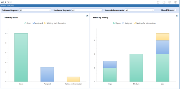 The following image shows the charts on the Ticket Analysis page, with the Closed status cleared for the Tickets by Status chart, and the Waiting for Information check box cleared for the Status by Priority chart.