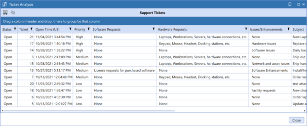 The selected tickets display in the support tickets grid window. Tickets in the window can be further grouped. See the sections in Manage Grid Items.