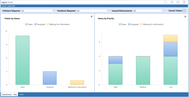 The bar charts group the tickets by status and priority. Click on any part of a bar in the charts to view the support tickets that are part of the clicked group. Clicking a specific area automatically filters the results based on your selection. For example, if you click on the Open bar from the Ticket by Status chart, the Support Tickets grid appears and displays only tickets in Open status. In the Status by Priority chart, the bars in the chart are sectioned according to priority. You can click on any area of the stacked bar in the chart to view details for just the status within the priority represented.