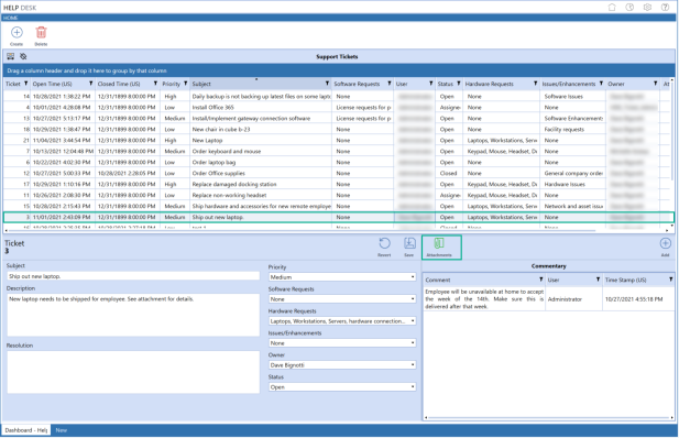 From within the Ticket Details grid, files can be attached (if not done at the create ticket stage) and comments can be added to any ticket to provide additional details.