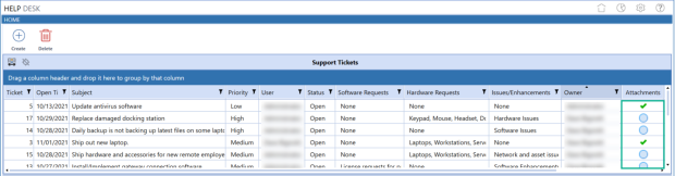 On the Ticket Request page, a green check in the Attachments column of the Support Tickets grid indicates whether a ticket includes attachments.